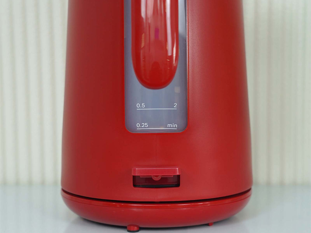 Bosch TWK2M164 được trang bị thang đo nước đặt dưới tay cầm, giúp người dùng dễ dàng quan sát mực nước bên trong ấm mà không cần mở nắp. Thiết kế này hiển thị song song theo cả lít và số cốc, giúp người dùng xác định chính xác lượng nước cần đun, từ đó pha trà, cà phê hay chuẩn bị nước nóng nhanh chóng và tiện lợi hơn. Vị trí thang đo ngay dưới tay cầm cũng giúp thao tác kiểm tra mực nước thuận tiện hơn mà không làm gián đoạn quá trình sử dụng.