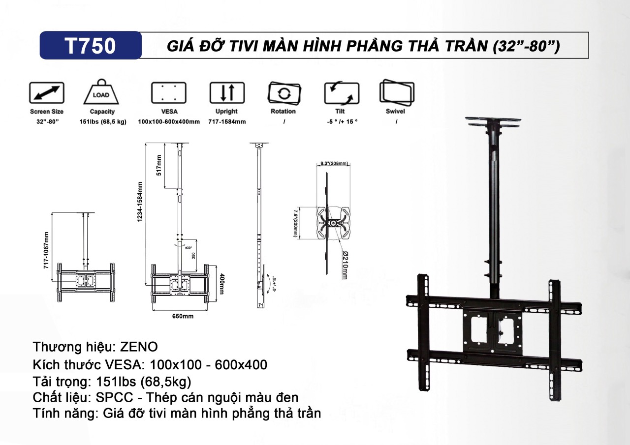THÔNG SỐ KỸ THUẬT CHI TIẾT GIÁ TREO TIVI THẢ TRẦN ZENO T750