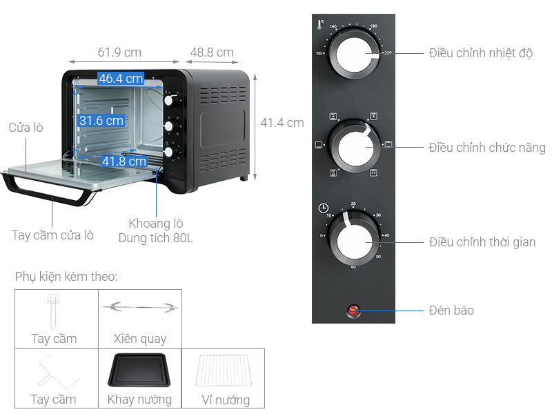 Với dung tích 80 lít, thiết bị nướng thực phẩm, bánh ngọt, bánh mì tiện lợi, nướng được 2 con gà nguyên con dưới 2 kg/con, lựa chọn lý tưởng cho gia đình đông thành viên, quán ăn, nhà hàng có lưu lượng khách lớn.