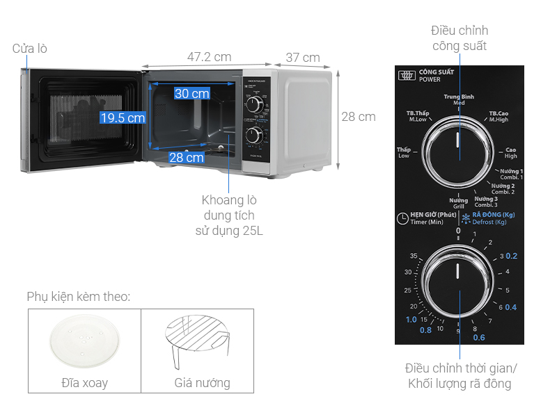 - Phụ kiện đi kèm: đĩa xoay, giá nướng.