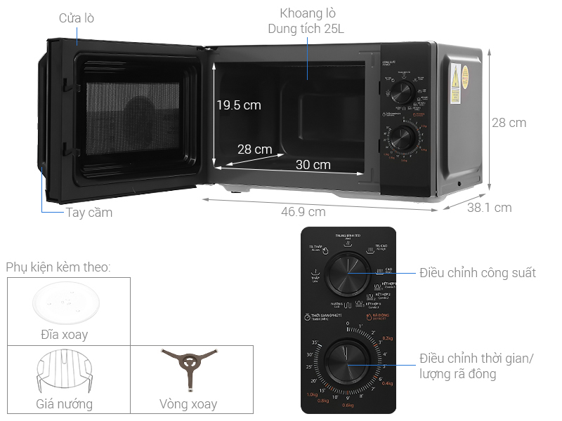- Phụ kiện đi kèm: đĩa xoay, giá nướng.