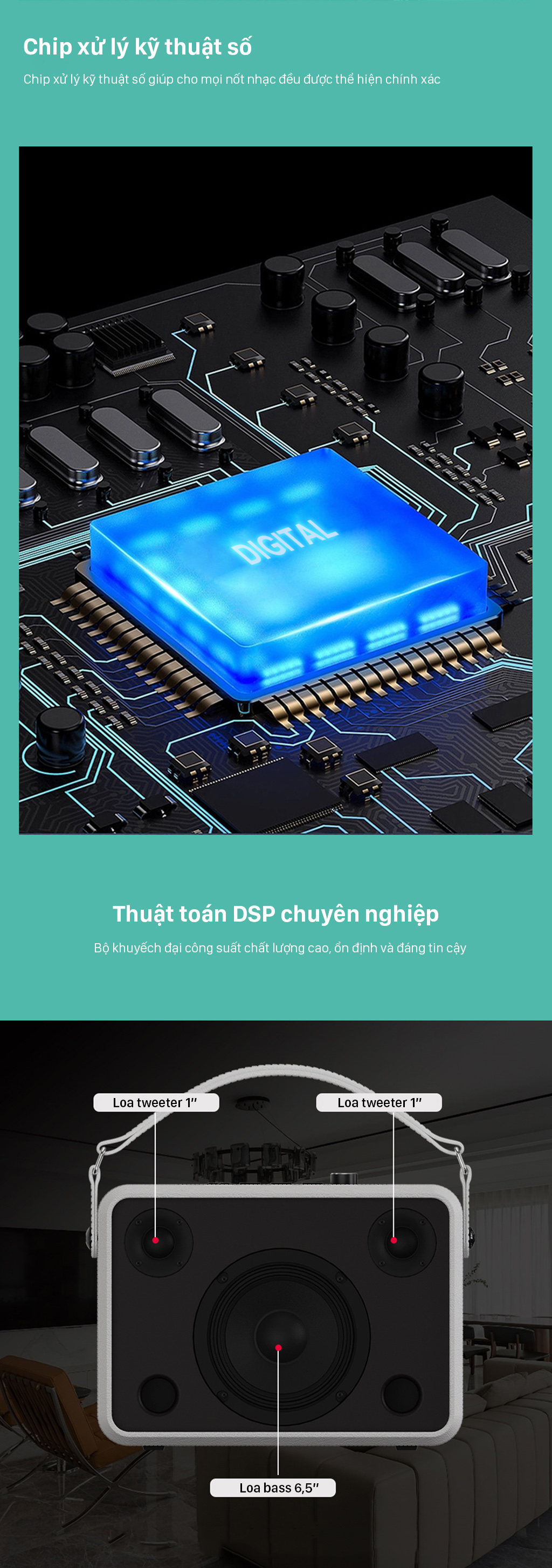 • Được trang bị bộ xử lý âm thanh DSP và hiệu quả với bộ khuếch đại class D hiệu suất cao.