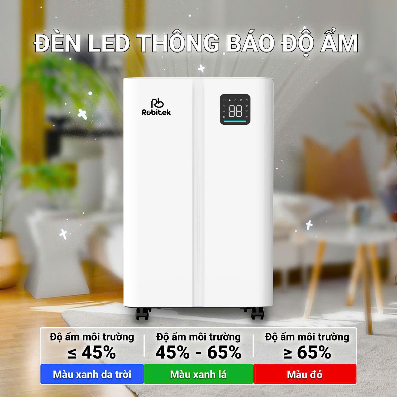 * Màu xanh dương (≤45%): Không khí khô, cần tăng độ ẩm.