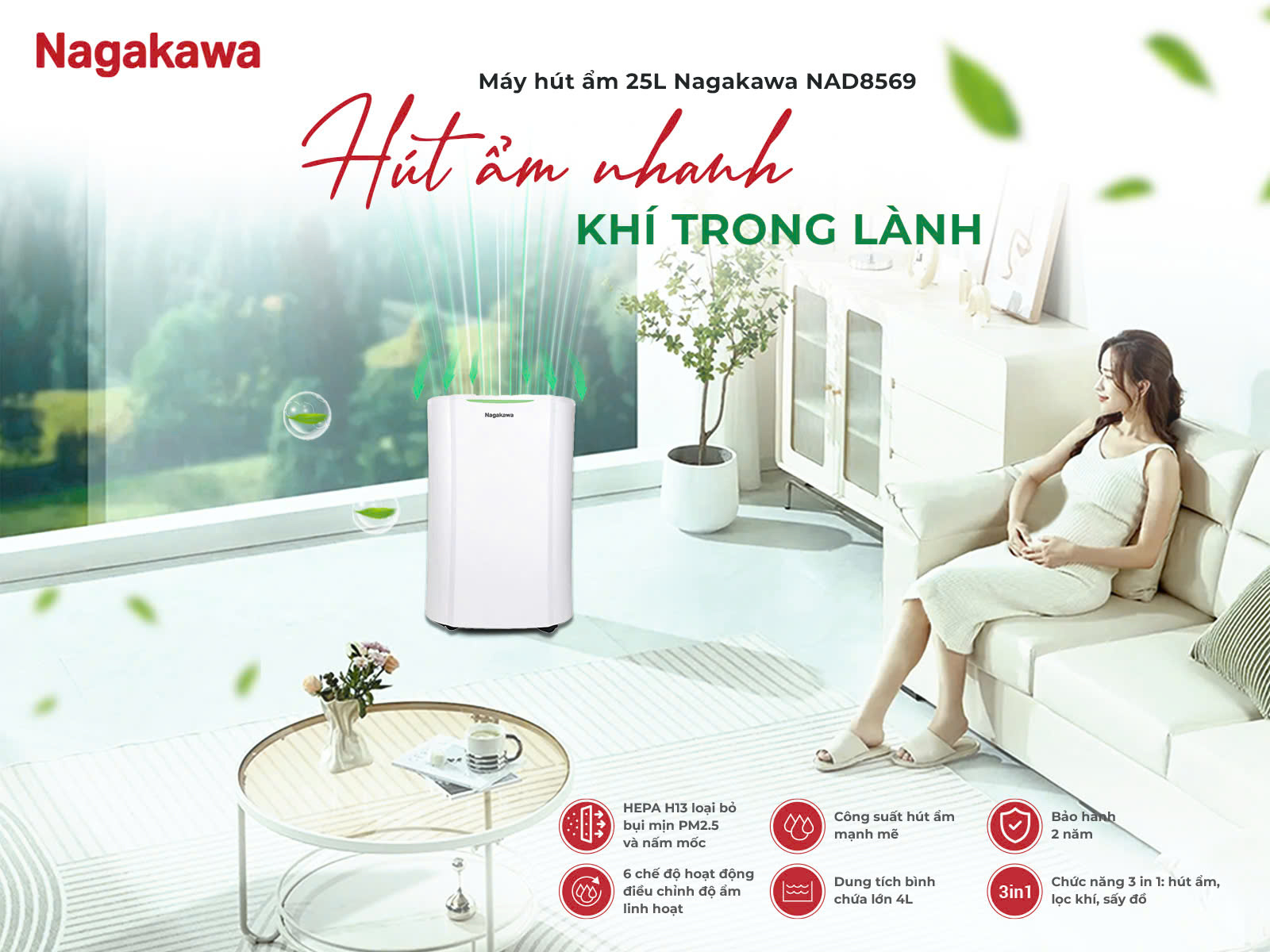 Máy hút ẩm lọc không khí Nagakawa NAD8569 là giải pháp hoàn hảo giúp chị em mình kiểm soát độ ẩm, bảo vệ sức khỏe gia đình và nâng cao chất lượng cuộc sống. Với thiết kế hiện đại, tính năng đa dạng và hiệu quả vượt trội, Nagakawa NAD8569 xứng đáng là "người bạn đồng hành" không thể thiếu trong mỗi gia đình.
