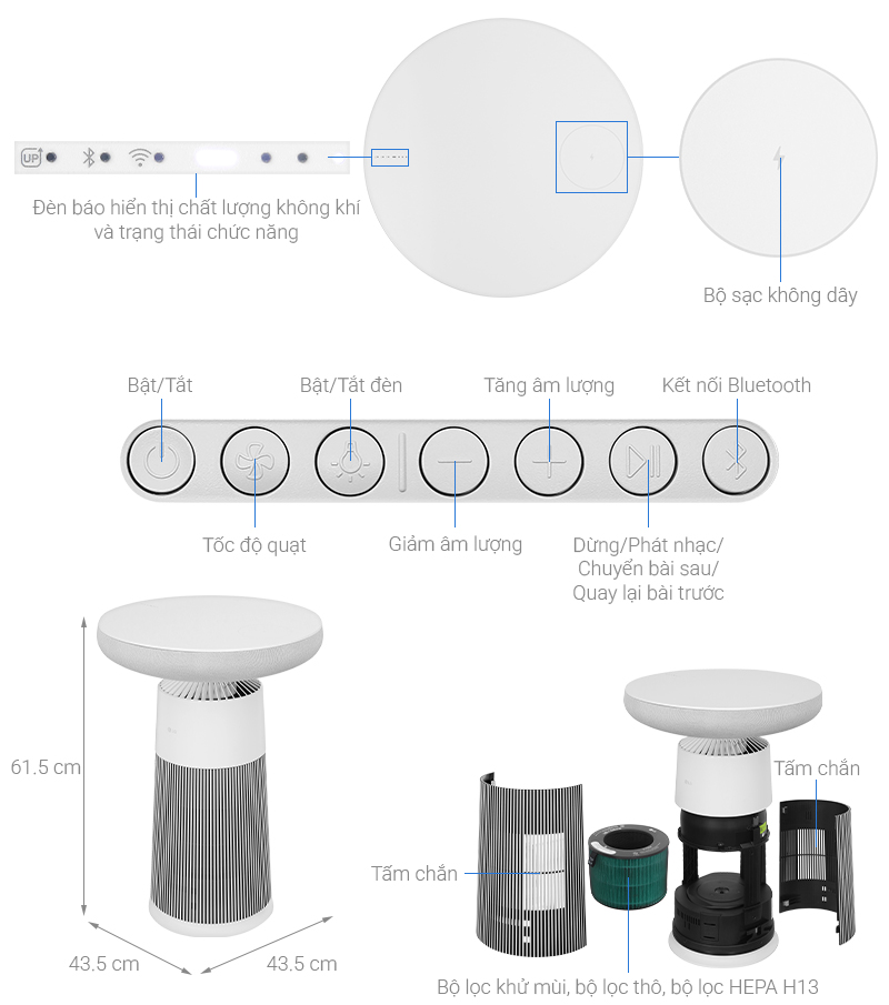 - Máy lọc không khí 4 chức năng trong 1: lọc không khí, loa Bluetooth, đèn màu theo tâm trạng và sạc không dây tiện dụng.