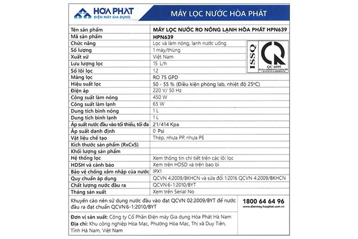 Thông số kỹ thuật Máy lọc nước nóng lạnh RO Hòa Phát HPN639