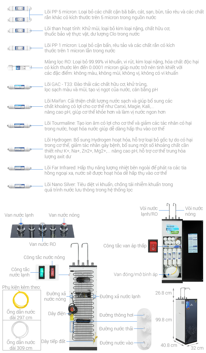 - Lõi Nano Silver (Sx Việt Nam): Tiêu diệt vi khuẩn, chống tái nhiễm khuẩn trong quá trình nước lưu thông trong hệ thống lọc.