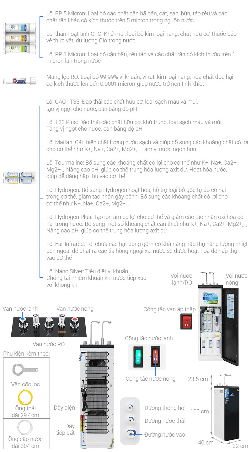- Lõi Tourmaline (Sx Việt Nam): Tạo ion âm có lợi cho cơ thể và giảm các tác nhân có hại trong nước, hoạt hóa nước giúp dễ dàng hấp thu vào cơ thể.