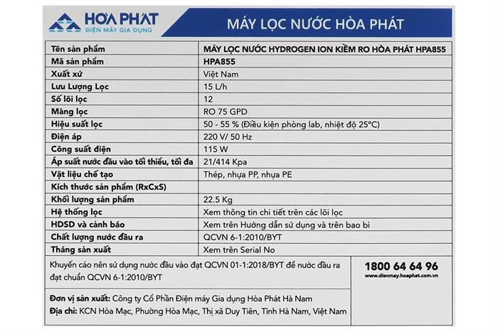 Thông số kỹ thuật Máy lọc nước RO Hydrogen ion kiềm Hòa Phát HPA855