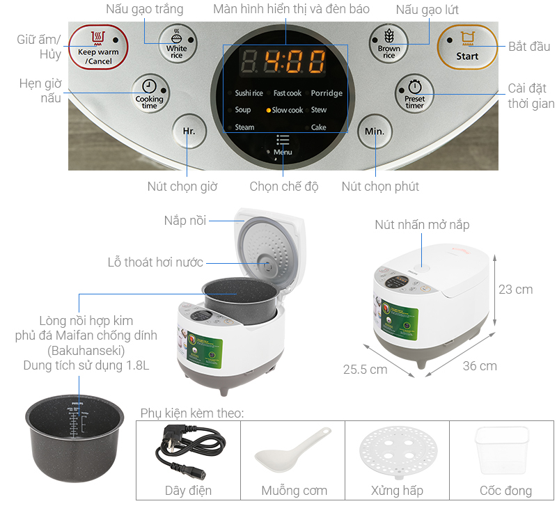 Thông số kỹ thuật Nồi cơm điện Philips 1.8 lít HD4515/55