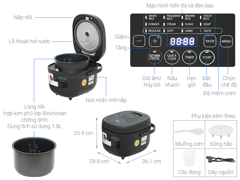 - Bạn có thể thỏa sức chế biến đa dạng món ăn vì nồi được lập trình sẵn 10 chương trình khác nhau bao gồm: gạo trắng (white rice), gạo thơm (fragrant rice), gạo lứt (brown rice), gạo nếp (sticky rice), cháo (congee), hấp (steam), cơm sushi (sushi), súp (soup), nấu nhanh (quick cook), giữ ấm (keep warm).