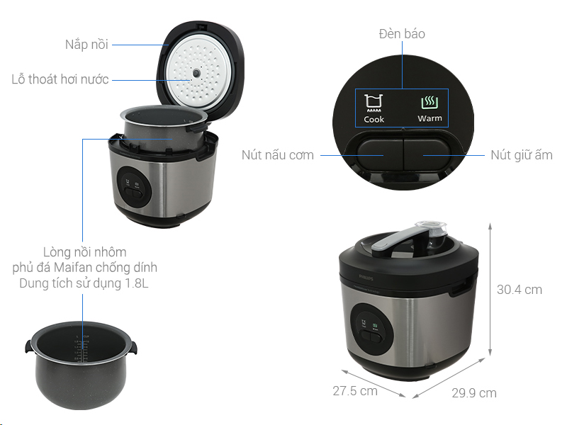 Thông số kỹ thuật Nồi cơm nắp gài Philips 1.8 lít HD3213/31