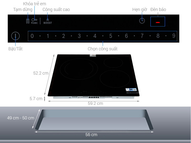 - Bếp từ Bosch đa dạng các tiện ích và tính năng an toàn khác: tự tắt khi bếp nóng quá tải, khóa bảng điều khiển, cảnh báo mặt bếp nóng,...