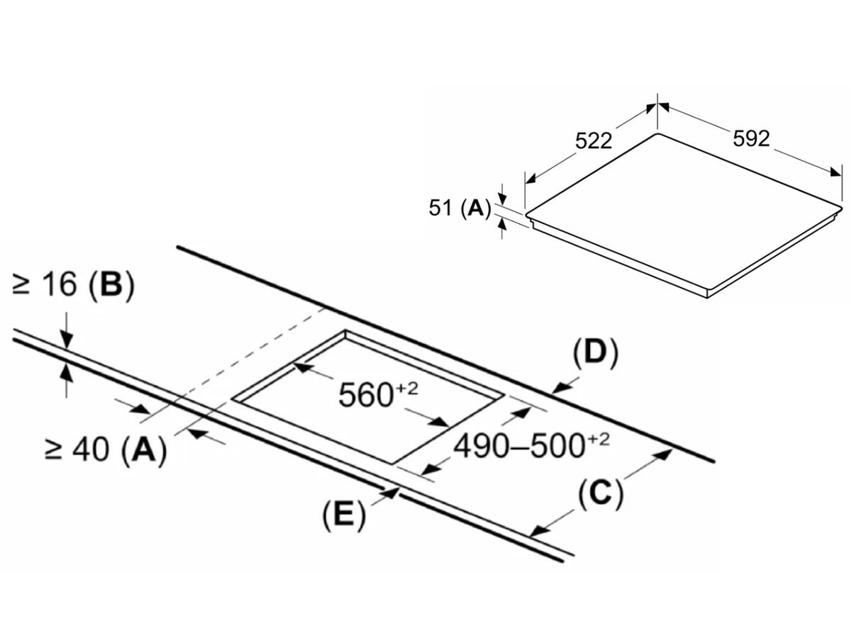 - Kích thước khoét đá: 51 x 560-560 x 490-500 mm
