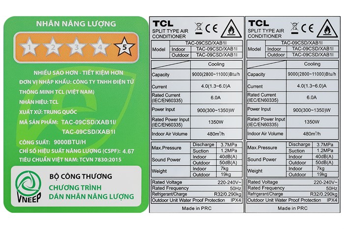 Sản phẩm đạt nhãn năng lượng 5 sao (Hiệu suất năng lượng 4.67).