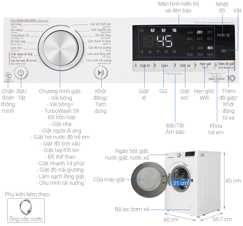Thông số kỹ thuật Máy giặt LG AI DD Inverter 10 kg FV1410S4W1