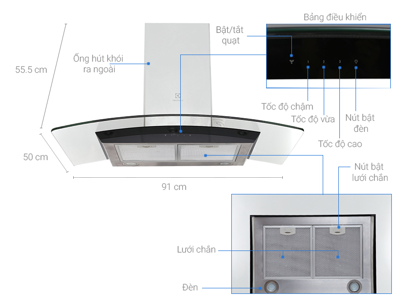 Thông số kỹ thuật chi tiết Máy hút mùi kính cong Electrolux EFC936GAR
