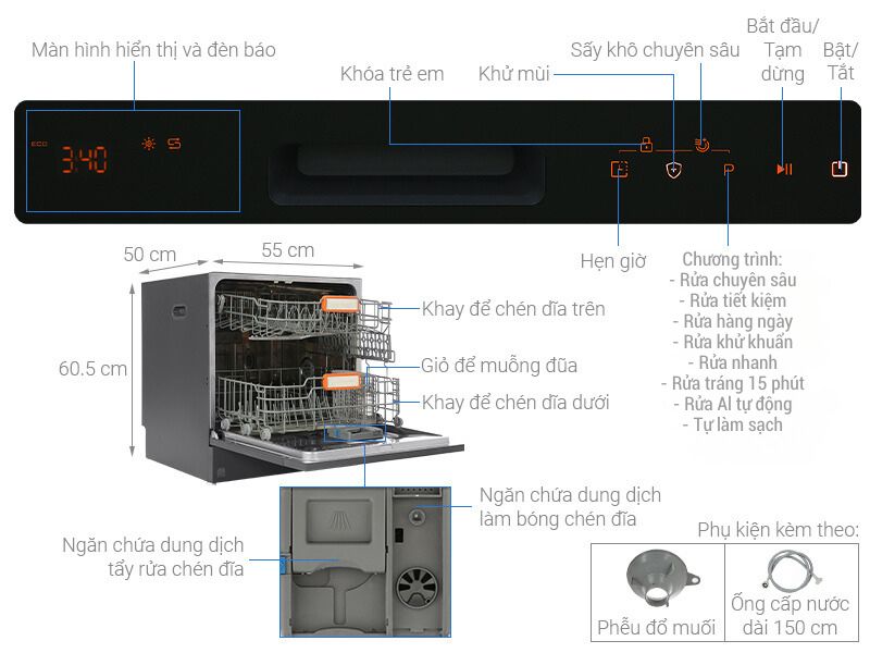 - Đèn LED báo hết muối, hết nước làm bóng: giúp bạn biết được thời điểm cần bổ sung muối và nước làm bóng cho máy, để mang lại hiệu quả rửa tốt hơn và chén đĩa được sáng bóng hơn.