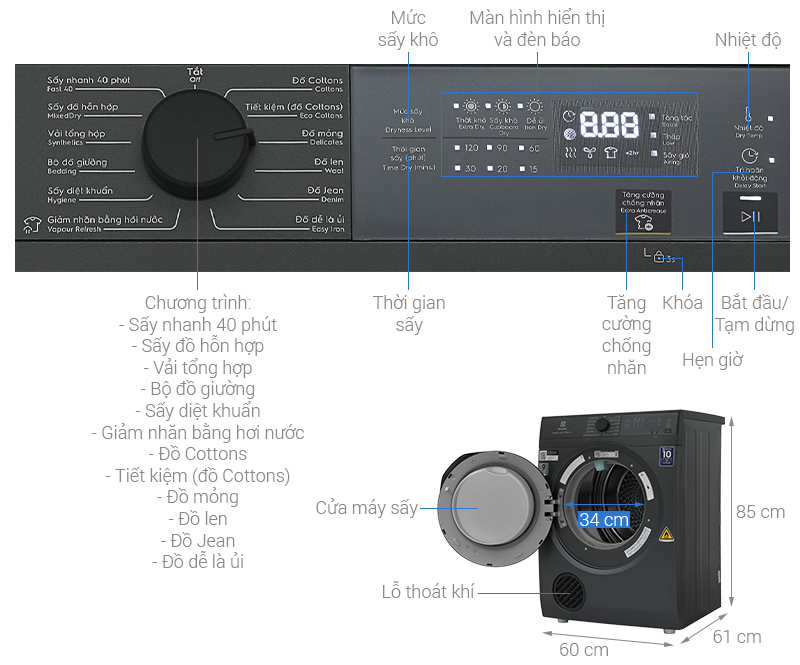 - Máy tích hợp nhiều chương trình sấy linh hoạt như sấy nhanh 40 phút, sấy hỗn hợp, sấy vải tổng hợp, sấy chăn ga,... Đặc biệt, chế độ sấy diệt khuẩn Hygiene giúp loại bỏ vi khuẩn và các tác nhân gây dị ứng, rất thích hợp cho quần áo trẻ em và người có làn da nhạy cảm.