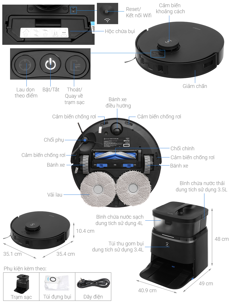 - Trạm sạc kết hợp thu gom bụi với túi chứa bụi dung tích 3.4 lít, bình chứa nước sạch dung tích 4 lít và bình chứa nước dơ dung tích 3.5 lít.