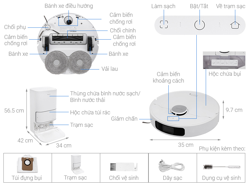 - Dung tích hộp chứa bụi là 350 ml giúp chứa được nhiều bụi bẩn hơn trong một lần dọn dẹp, tích hợp khả năng làm ướt khăn lau ngay tại trạm sạc vô cùng tiện lợi.