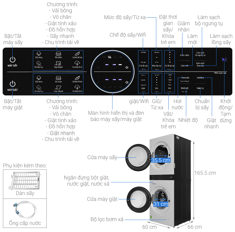 - Bảng điều khiển cảm ứng chỉ dẫn tiếng Việt kết hợp màn hình hiển thị sắc nét, thiết kế trực quan và nằm ngay ở vị trí trung tâm, bố trí cao hơn bảng điều khiển của 2 máy giặt và máy sấy đặt chồng lên nhau đến 85 mm. Nhờ đó người dùng dễ dàng tiếp cận và tùy chỉnh chương trình giặt, sấy linh hoạt.