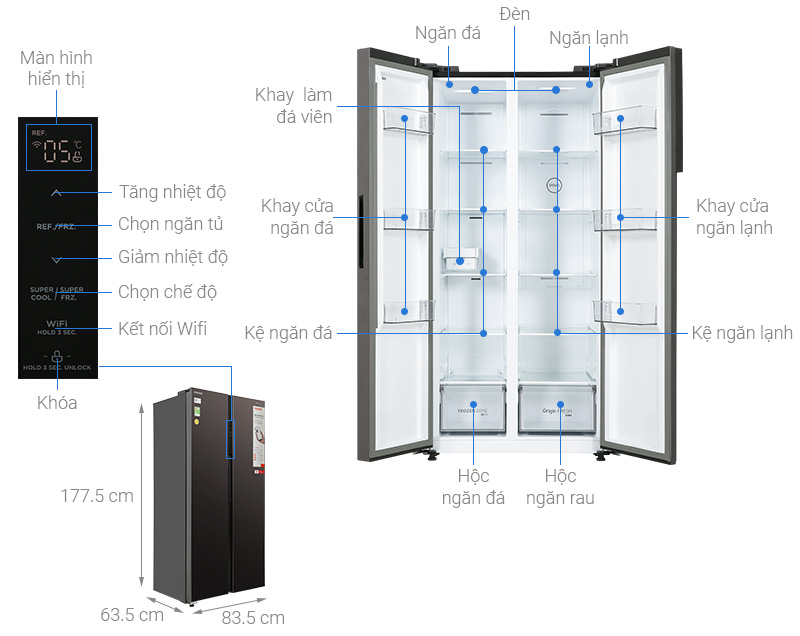 Tủ lạnh có chiều cao 177.5 cm, rộng 83.5 cm, sâu 63.5 cm phù hợp với không gian căn bếp có diện tích từ trung bình đến rộng, tủ thiết kế không quá cao nên sẽ không làm bạn quá khó khăn để sắp xếp thực phẩm lên ngăn cao nhất tủ.
